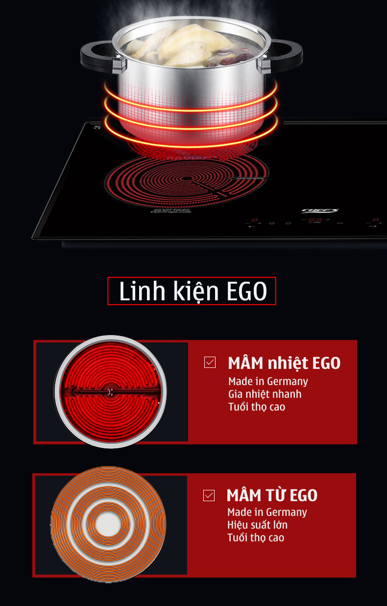 Chính những linh kiện EGO đã tạo ra hiệu suất đun nấu hoàn hảo cho bếp điện từ Chefs EH MIX866, nâng cao khả năng tối ưu hóa sử dụng năng lượng điện đầu vào, giảm chi phí điện cho các gia đình khi sử dụng bếp mà vẫn mang lại hiệu quả cao nhất. Thêm nữa bếp còn được trang bị những tính năng an toàn chống quá tải điện áp giúp bảo về bếp và người sử dụng an toàn khi có sự cố điện trong gia đình.